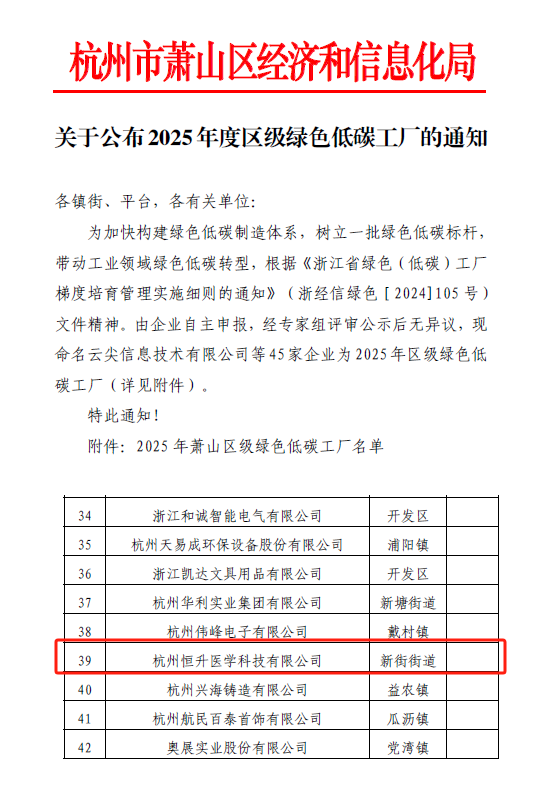 杭州恒升醫(yī)學(xué)科技有限公司獲評2025年度蕭山區(qū)“綠色低碳工廠”稱號簡報(bào)